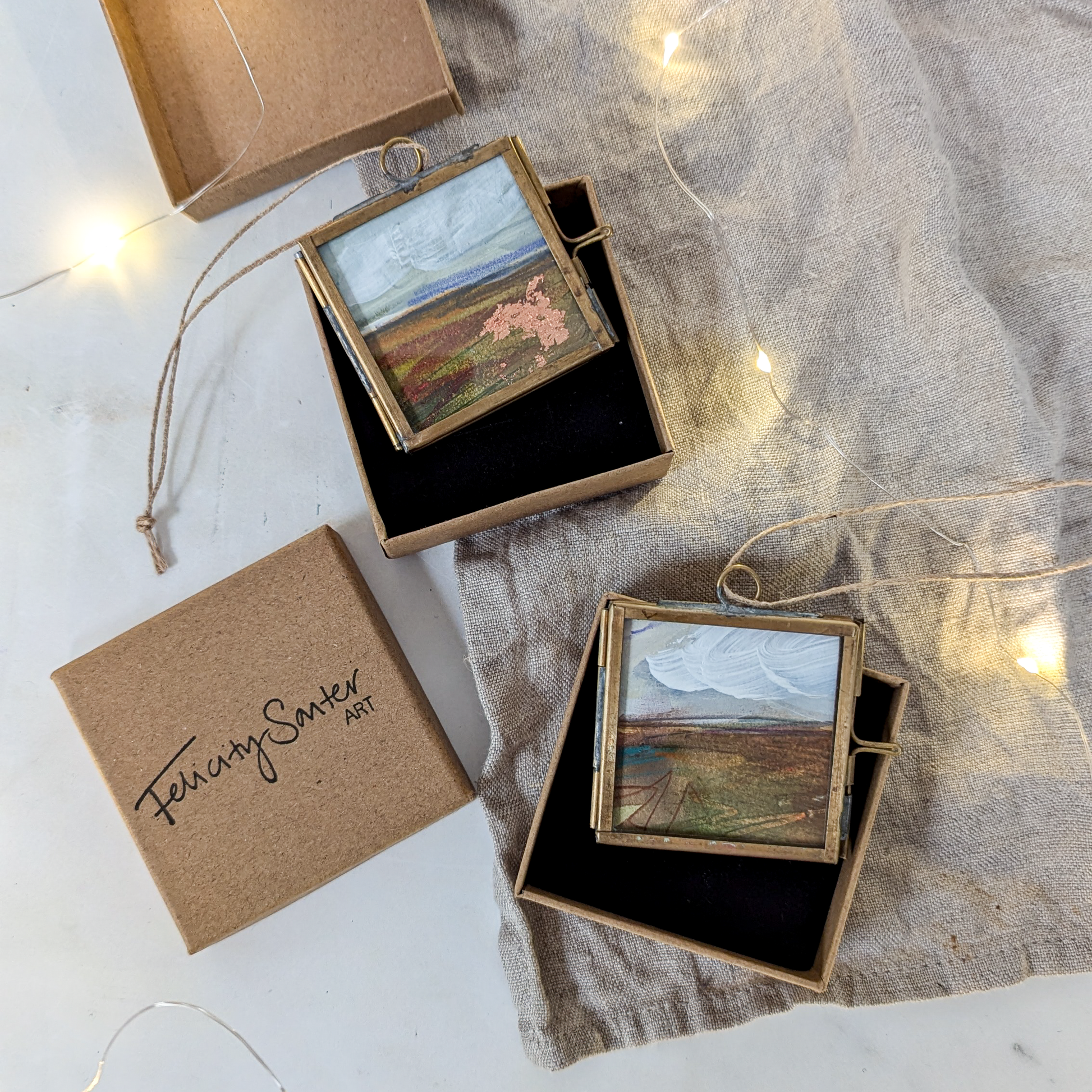 For me, Christmas is the most sentimental time of the year. Growing up, our family tree always felt extra special because instead of the traditional baubles, we had ornaments of every shape and style; little treasures our family had collected from around the world - hand-painted terracotta ornaments from Prague, mini ceramic shoes from NYC, tiny knitted jumpers, and flat brass instruments (which still stubbornly refuse to hang the right way round...) Decorating the tree each year is a treasured ritual, even though I now have a tree of my own. We play old school Christmas jazz and pull out each ornament, sparking memories of travels and our favourite places. And this is why I wanted to make these decorations. These tiny landscape paintings are each lovingly hand-painted by me, to help spark those wonderful memories for you and your family; a great ski trip with friends, or the beach you visit each summer.