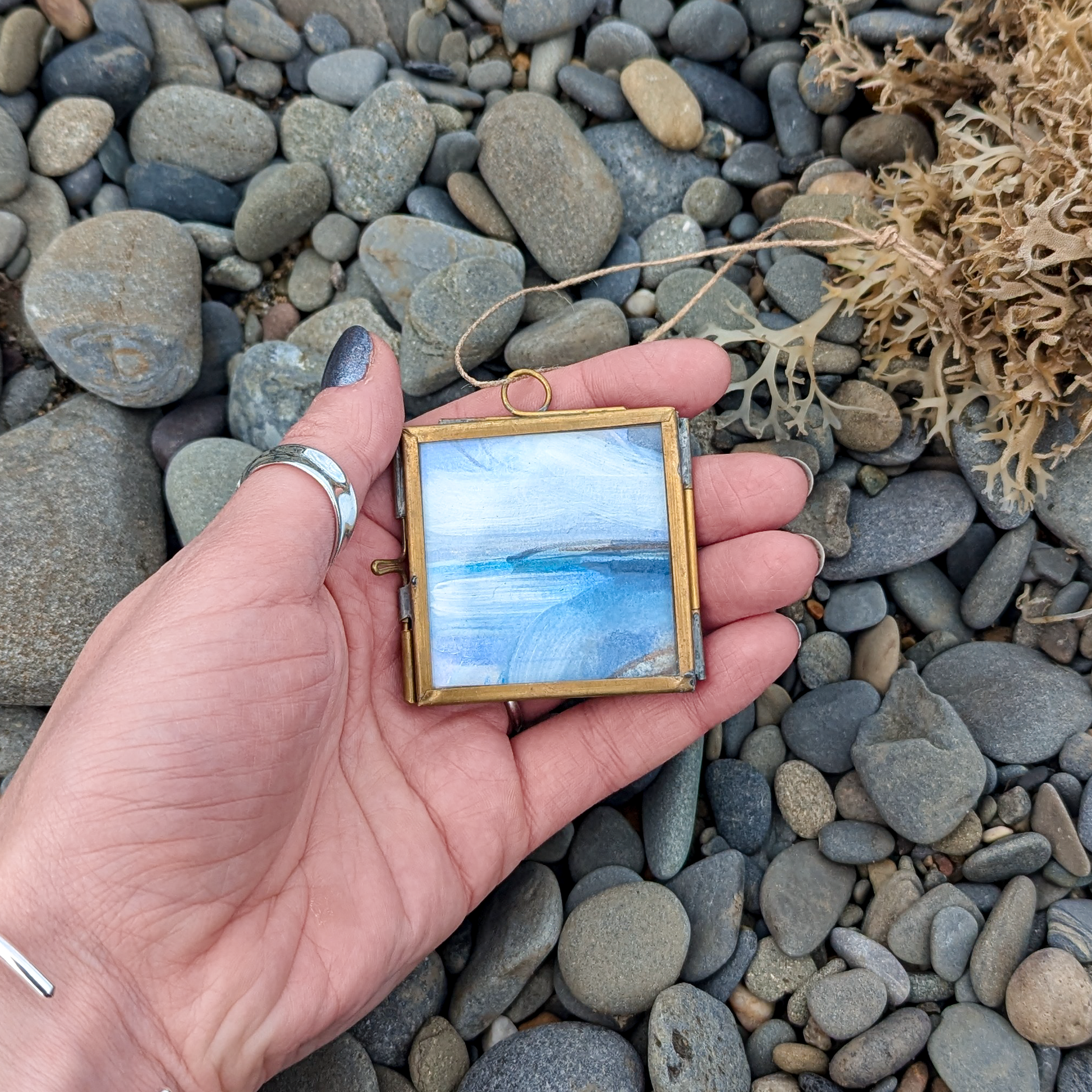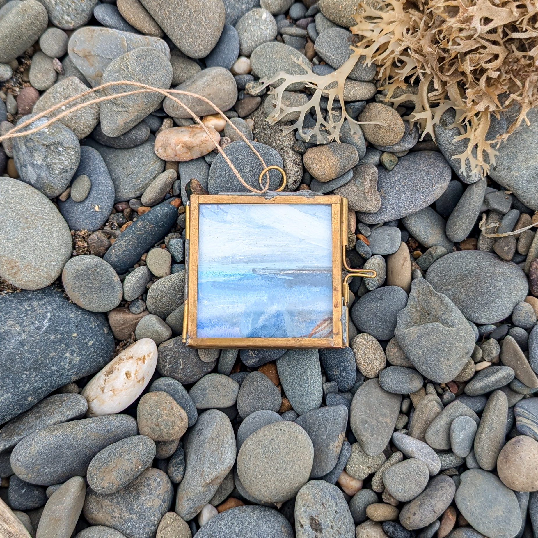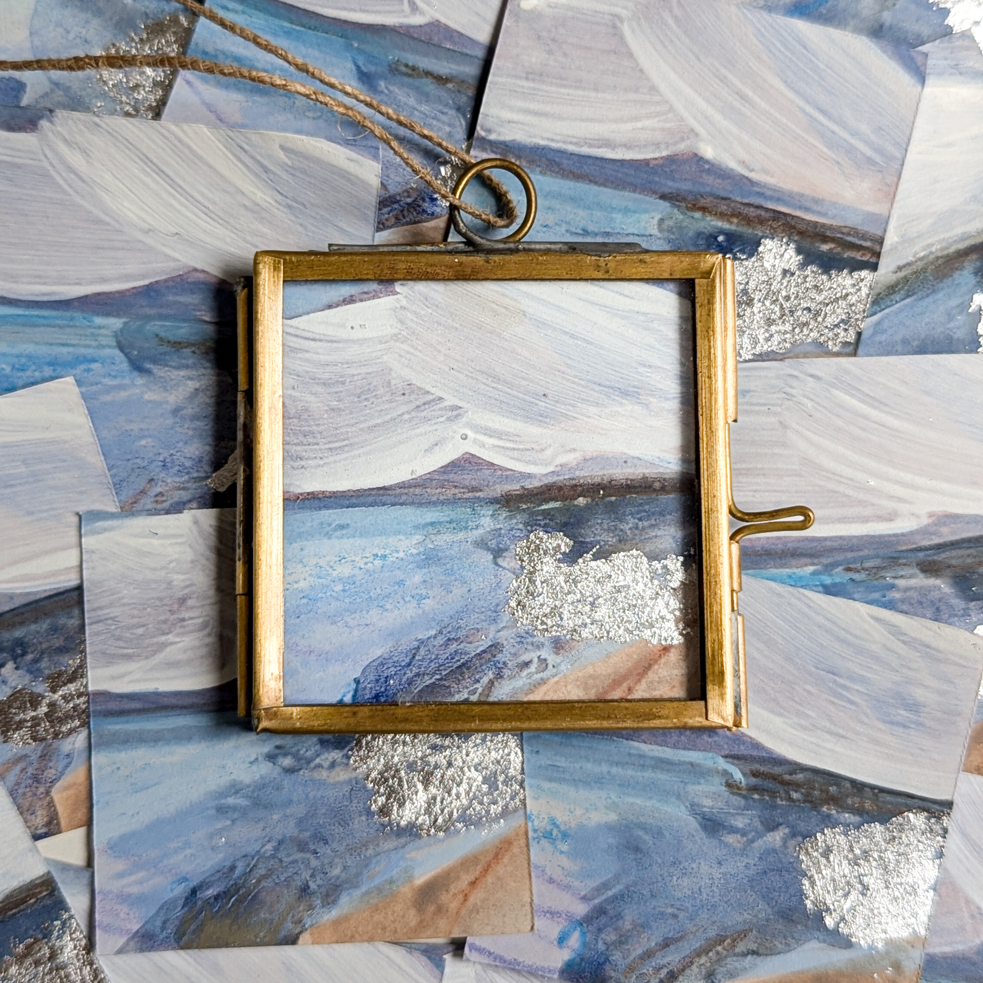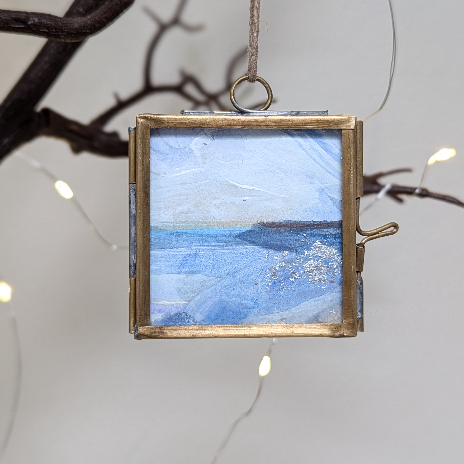 Framed in 5x5cm brass frame with glass windows and neutral twine thread - ready to hang on your Christmas tree