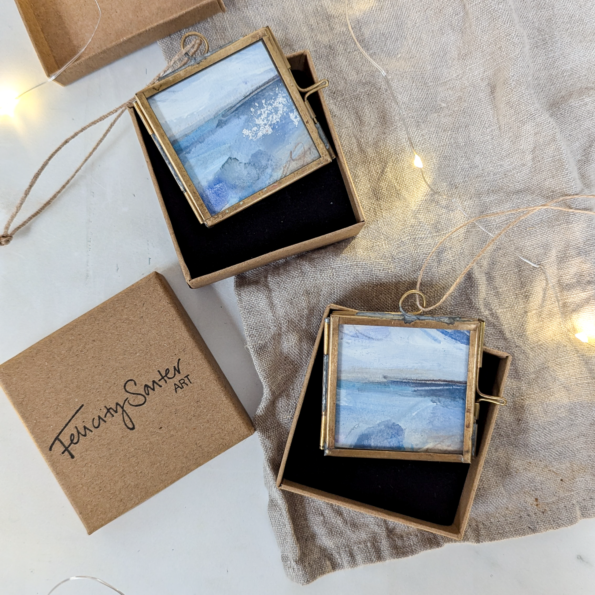 For me, Christmas is the most sentimental time of the year. Growing up, our family tree always felt extra special because instead of the traditional baubles, we had ornaments of every shape and style; little treasures our family had collected from around the world - hand-painted terracotta ornaments from Prague, mini ceramic shoes from NYC, tiny knitted jumpers, and flat brass instruments (which still stubbornly refuse to hang the right way round...) Decorating the tree each year is a treasured ritual, even though I now have a tree of my own. We play old school Christmas jazz and pull out each ornament, sparking memories of travels and our favourite places. And this is why I wanted to make these decorations. These tiny landscape paintings are each lovingly hand-painted by me, to help spark those wonderful memories for you and your family; a great ski trip with friends, or the beach you visit each summer.