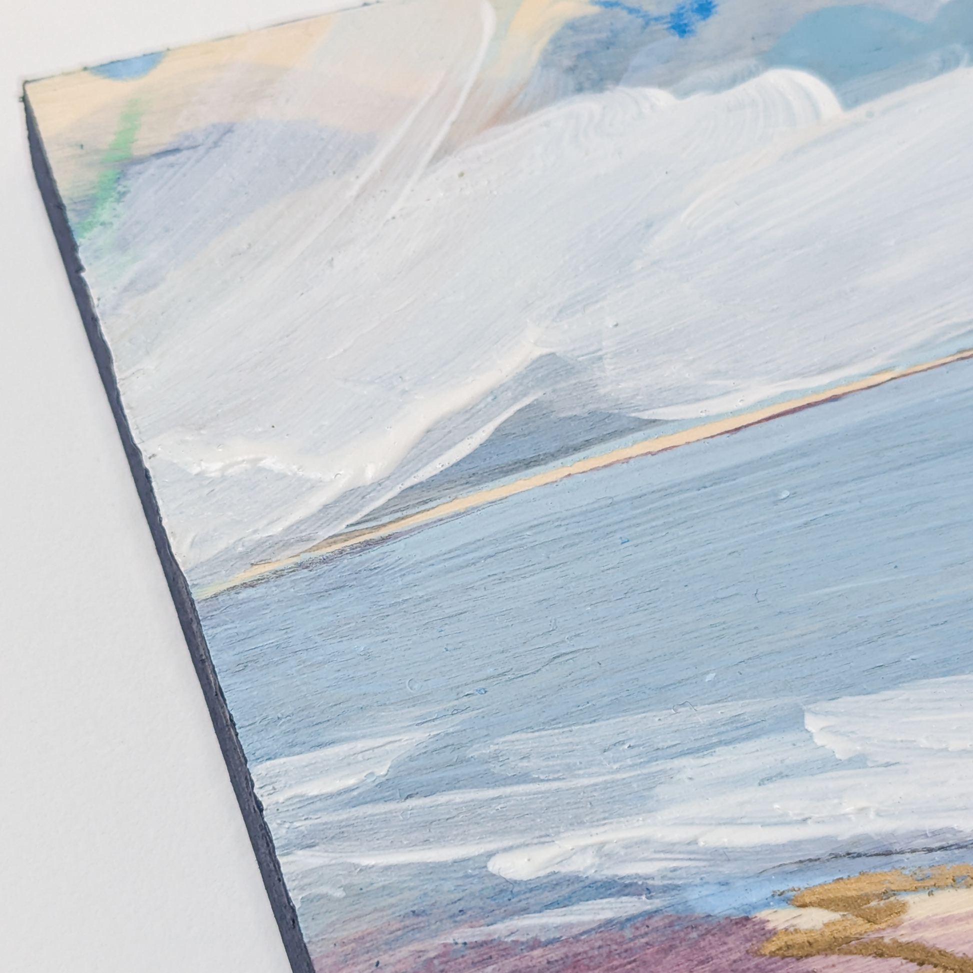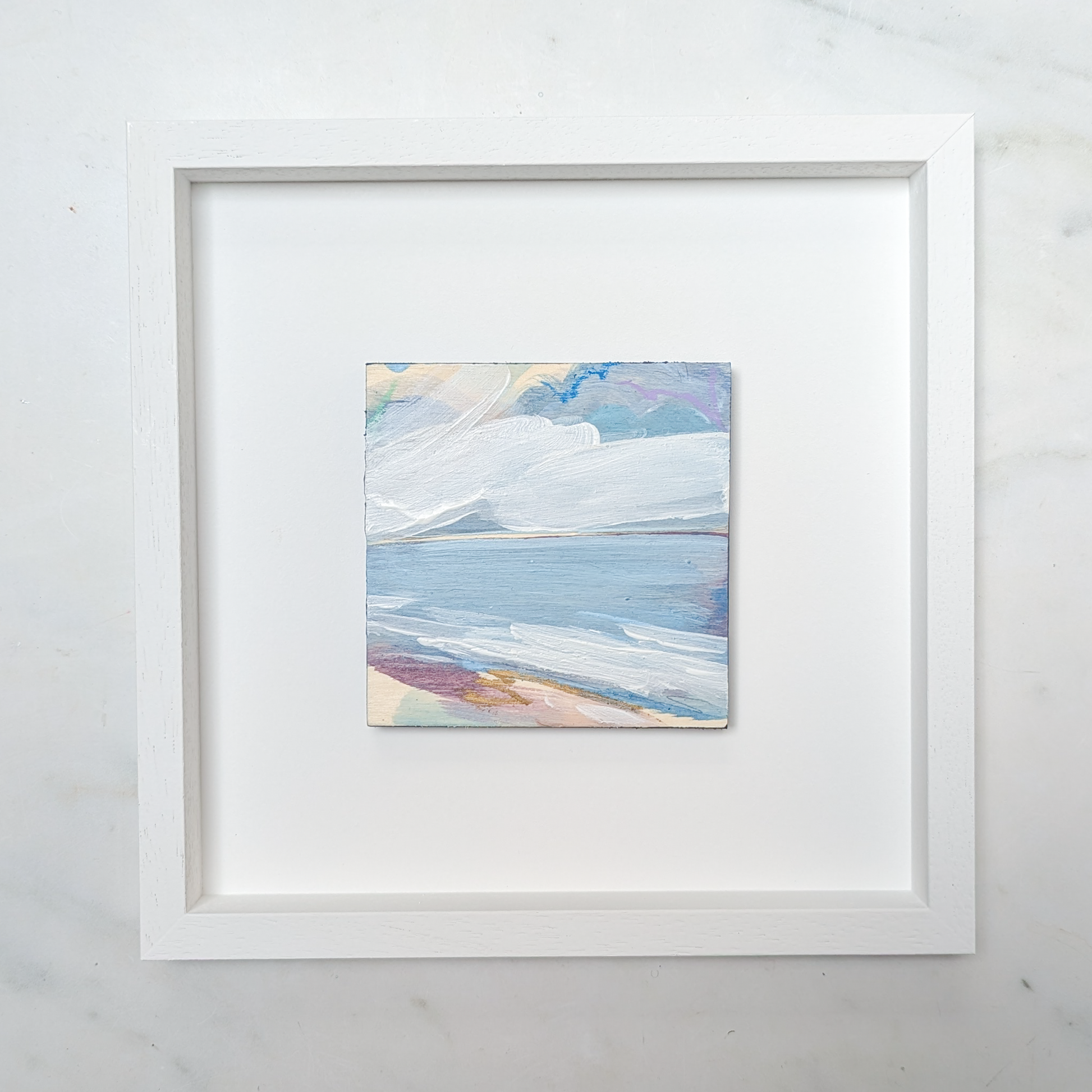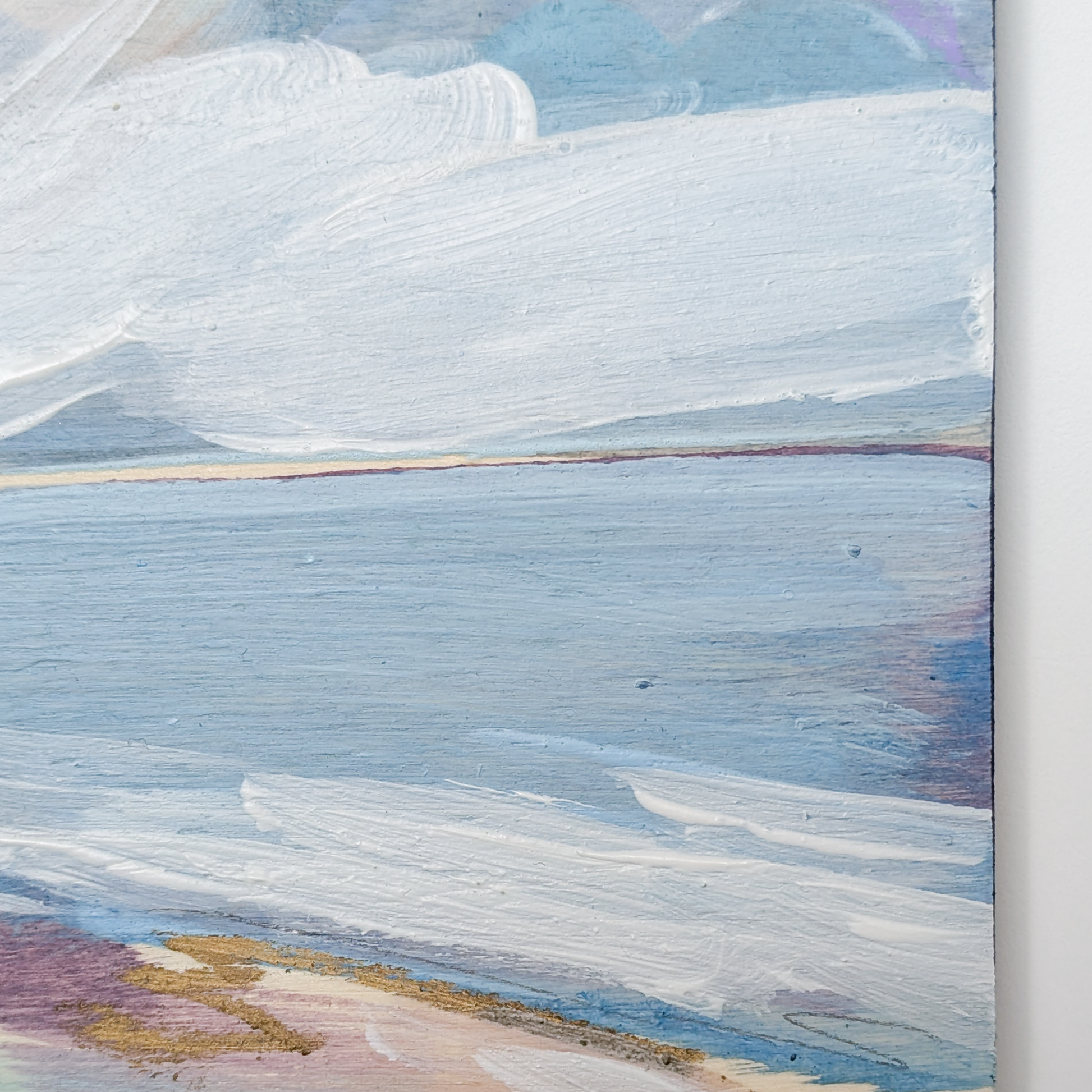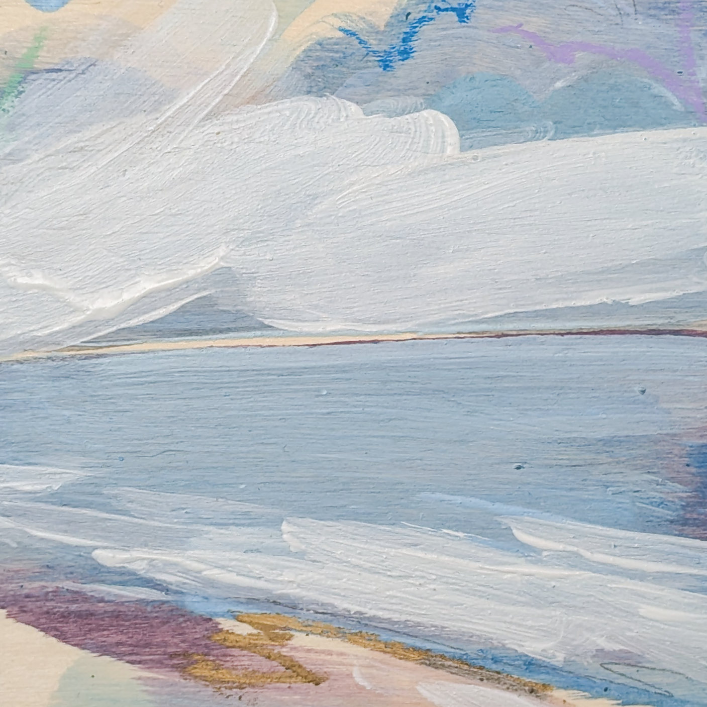 About this Painting: I painted Pastel Shores to reflect the soft, hazy beauty of a quiet shoreline under a pale sky. The gentle pastel tones are inspired by those peaceful moments when the light is low and everything feels hushed and still—when sea, sand, and sky seem to blur into one calming whole.