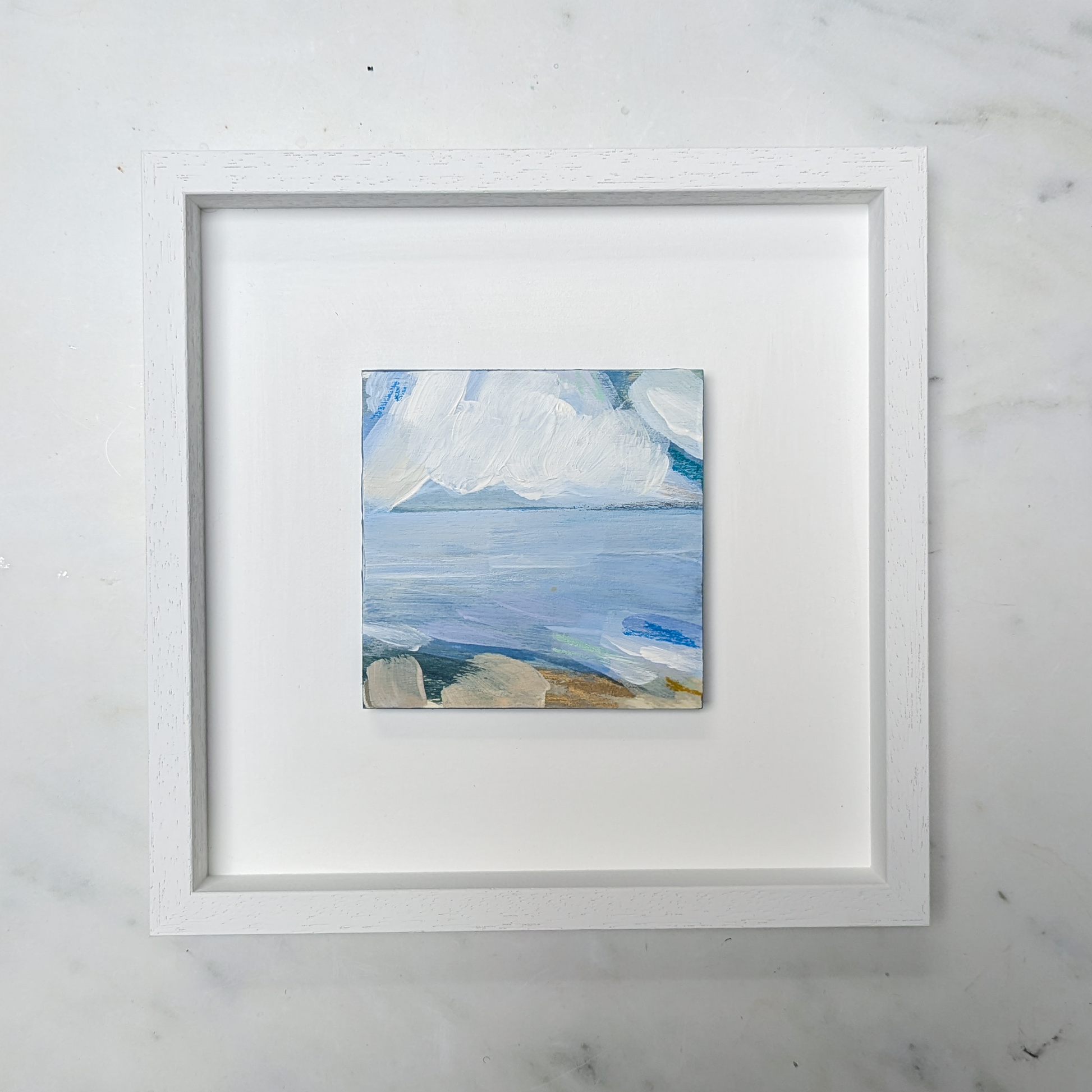 About this Painting: Rain on the Horizon captures the quiet moment when rain approaches over the sea. The soft, muted colours and delicate brushstrokes reflect the calm before the shower.