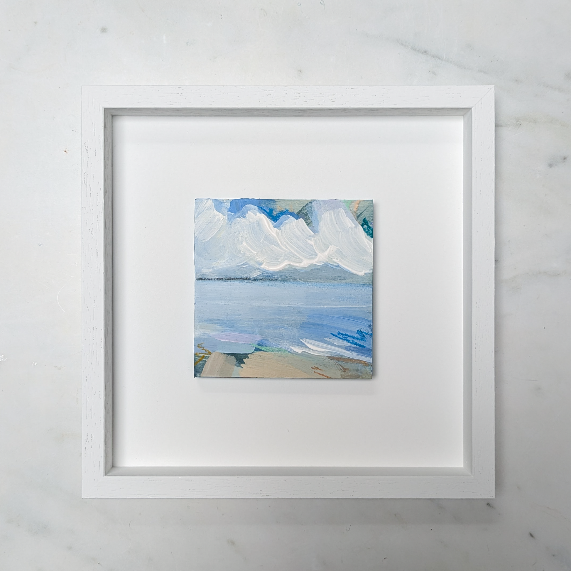 About this Painting: Rain on the Horizon captures the quiet moment when rain approaches over the sea. The soft, muted colours and delicate brushstrokes reflect the calm before the shower.