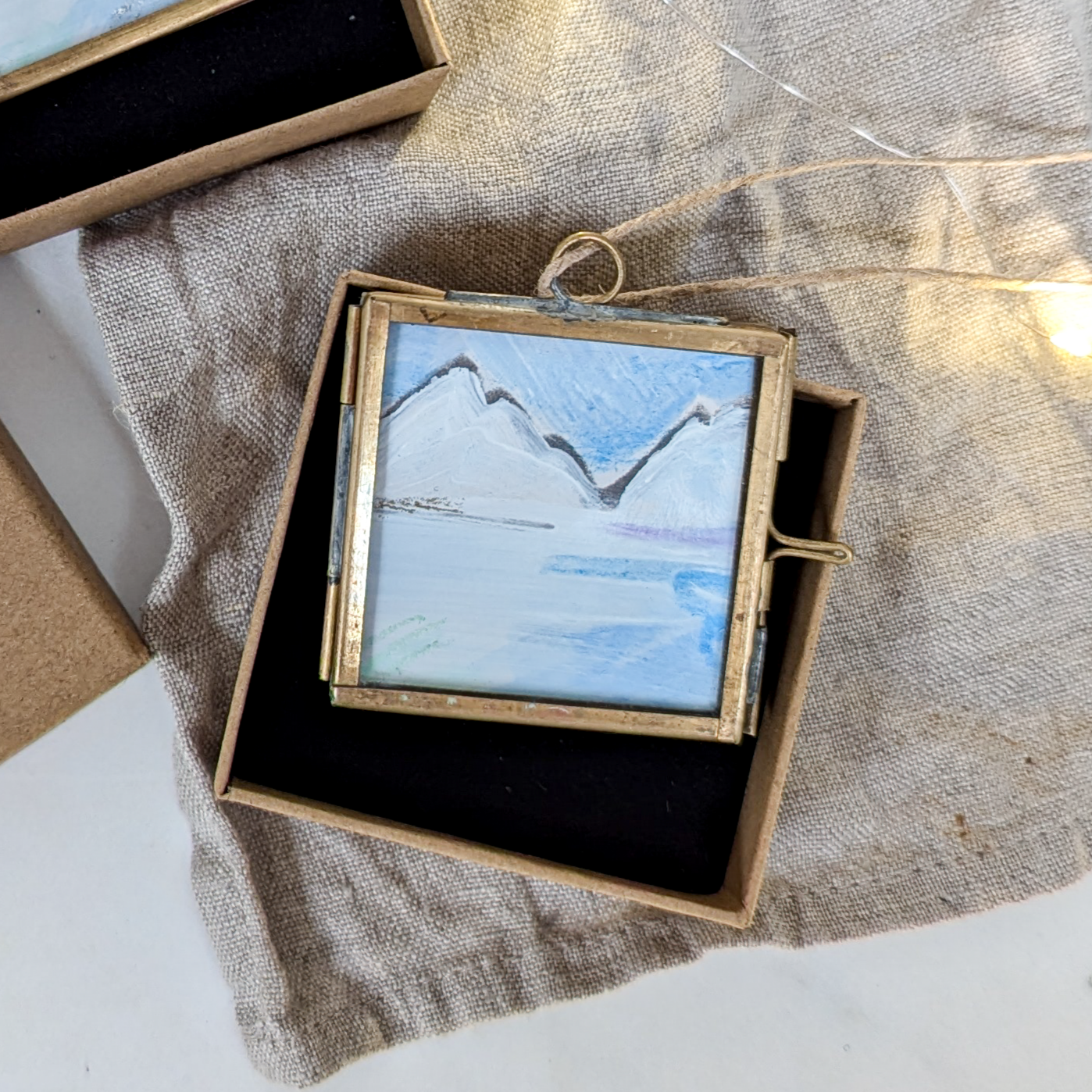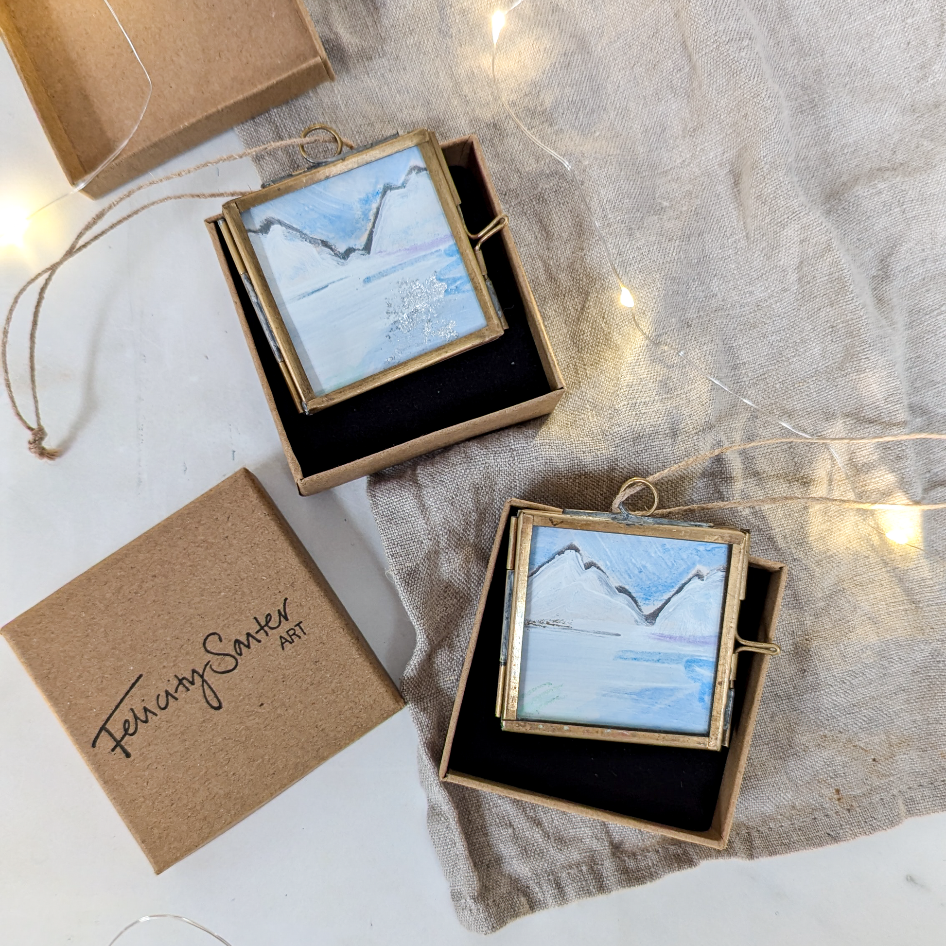 For me, Christmas is the most sentimental time of the year. Growing up, our family tree always felt extra special because instead of the traditional baubles, we had ornaments of every shape and style; little treasures our family had collected from around the world - hand-painted terracotta ornaments from Prague, mini ceramic shoes from NYC, tiny knitted jumpers, and flat brass instruments (which still stubbornly refuse to hang the right way round...) Decorating the tree each year is a treasured ritual, even though I now have a tree of my own. We play old school Christmas jazz and pull out each ornament, sparking memories of travels and our favourite places. And this is why I wanted to make these decorations. These tiny landscape paintings are each lovingly hand-painted by me, to help spark those wonderful memories for you and your family; a great ski trip with friends, or the beach you visit each summer.