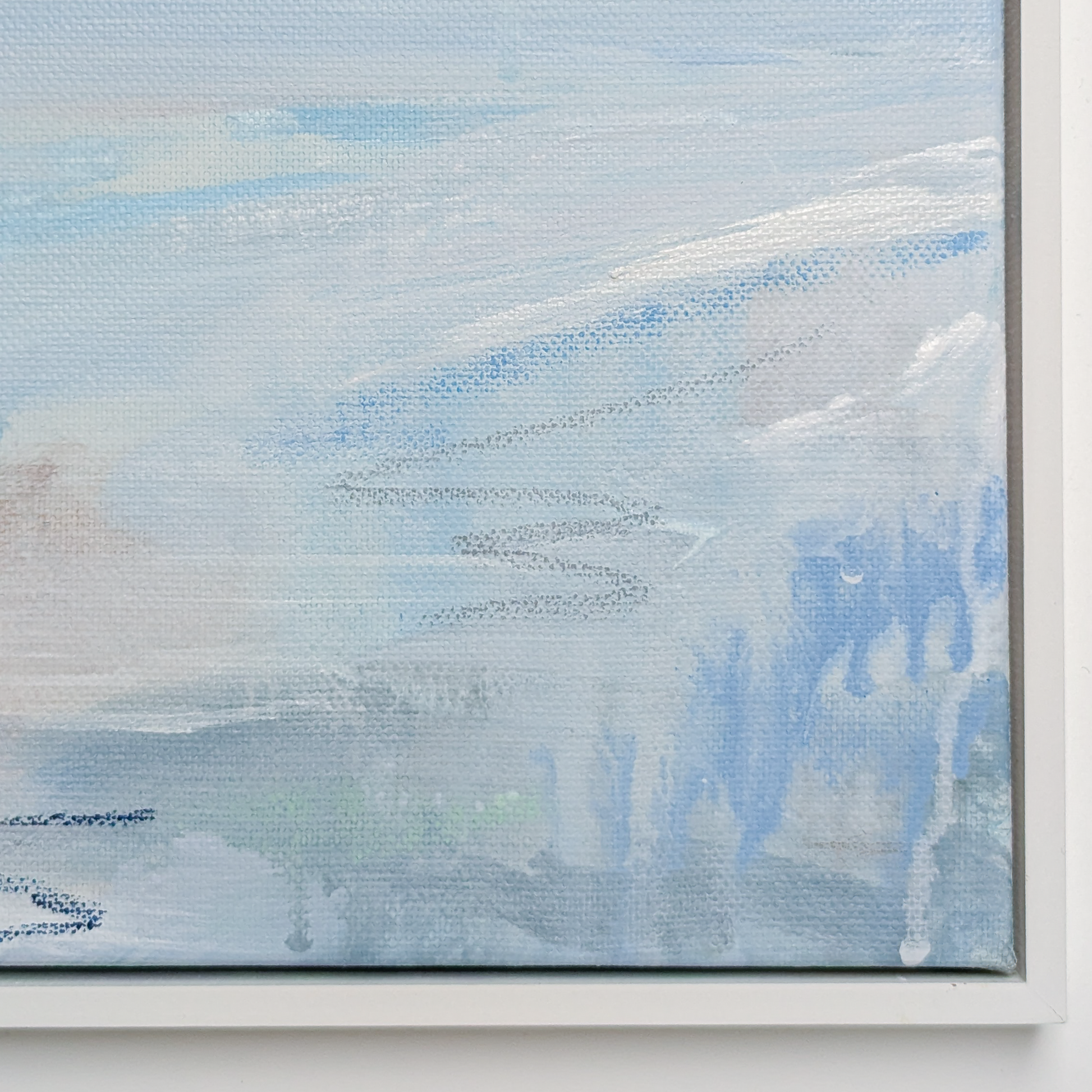 About this Painting: Winter on the Lake captures the quiet moment when Winter arrives and the world begins to freeze. Soft layers of blue and white reflect the stillness of the season—the hush of cold air, the delicate shimmer of ice forming across the surface.